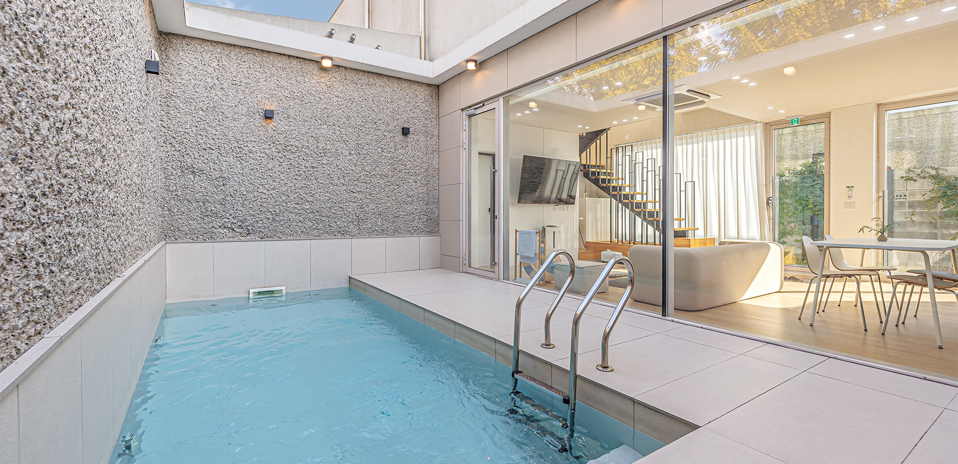 침대룸A(더블2) + 화장실2 + 거실1, 29평(약 96.0㎡), 복층, 독채, 개별수영장, 자쿠지