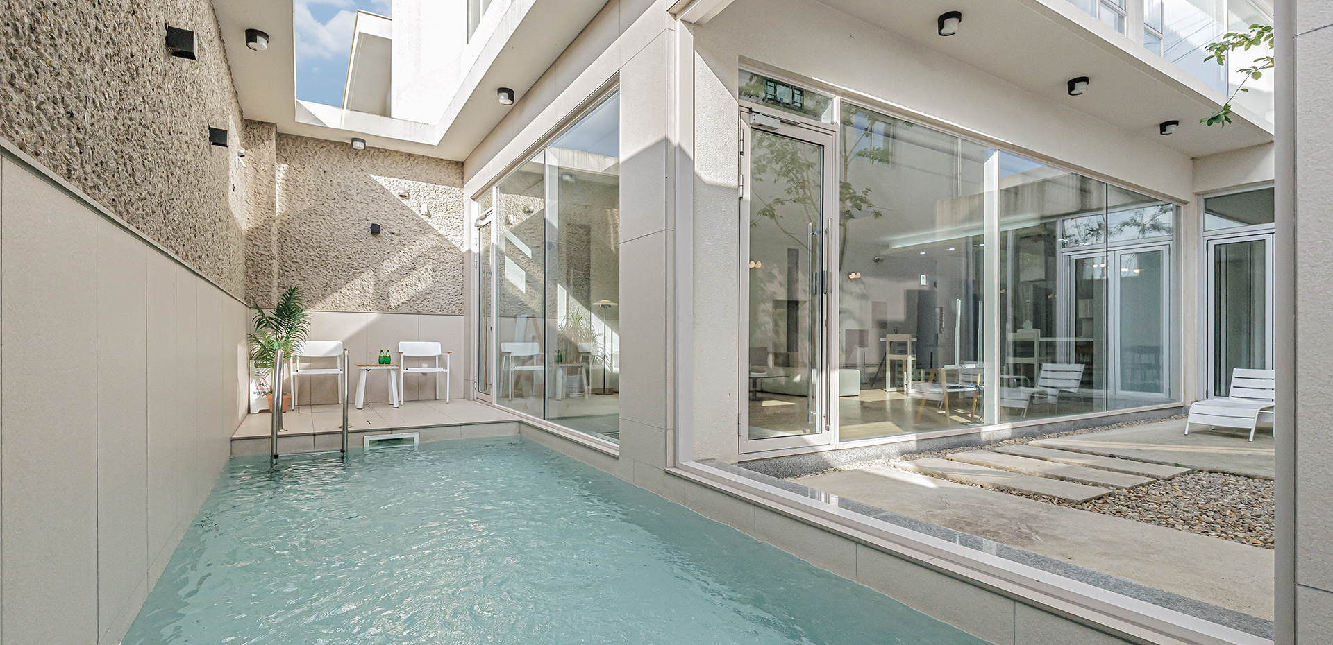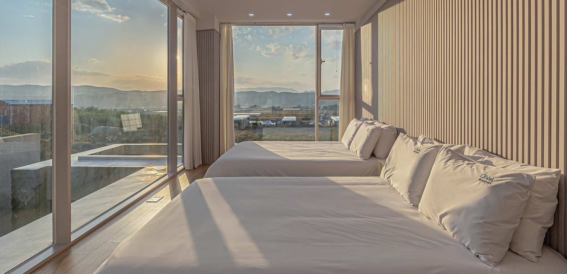 침대룸A(더블2) + 침대룸B(더블2) + 화장실2 + 거실1, 34평(약 113.0㎡), 복층, 테라스바베큐가능, 독채, 개별수영장